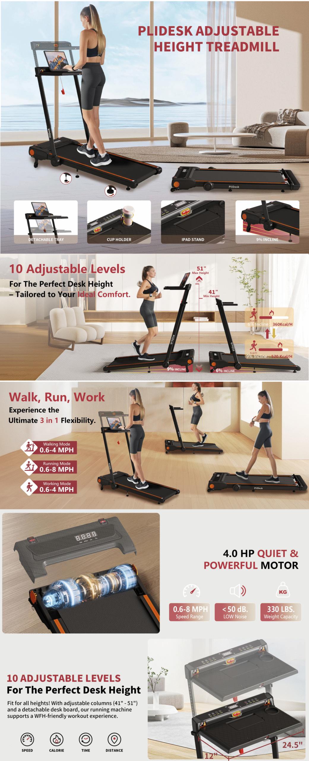 Plidesk 3 in 1 Under Desk Treadmill 10-level adjustable handrail